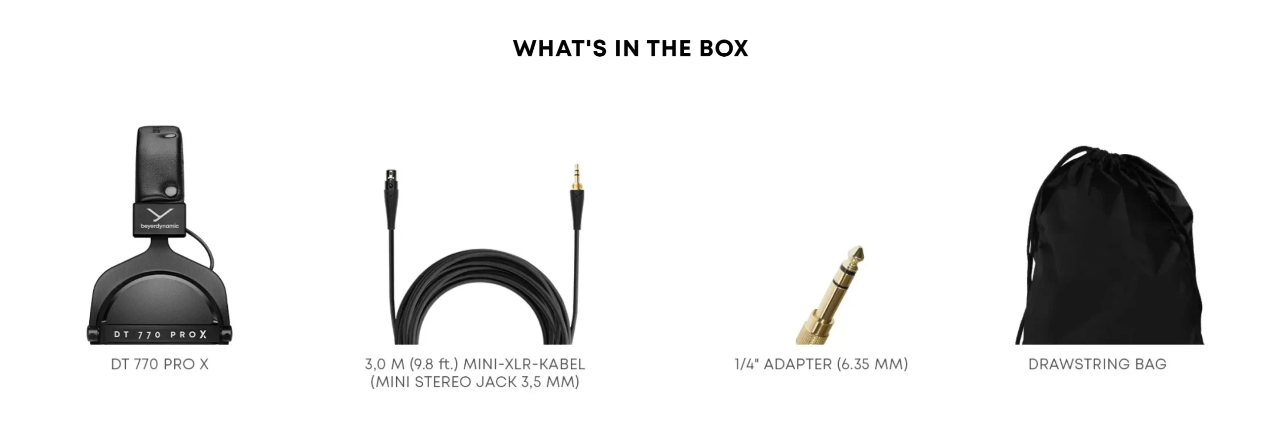Cáp có thể tháo rời: Một cải tiến đáng chú ý so với phiên bản DT 770 PRO truyền thống, DT 770 PRO X được trang bị cáp thẳng dài 3 mét có thể tháo rời với đầu nối mini XLR 3 chân khóa, tăng tính linh hoạt và độ bền. Tai nghe đi kèm với jack cắm stereo 3.5mm và adapter 6.35mm.