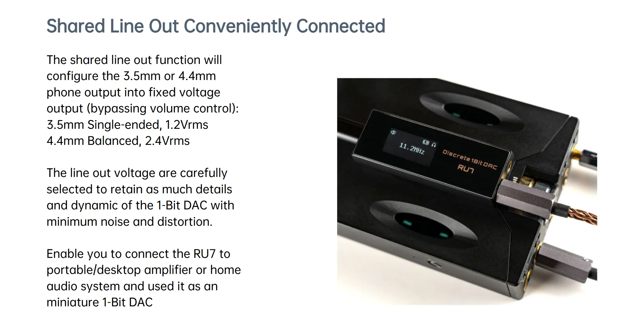 Cả hai cổng 3.5mm và 4.4mm đều có thể chuyển sang chế độ Line Out với mức điện áp cố định. (1.2Vrms cho 3.5mm và 2.4Vrms cho 4.4mm). Điều này cho phép RU7 hoạt động như một DAC thuần túy để kết nối với các bộ khuếch đại ngoài hoặc dàn âm thanh gia đình.