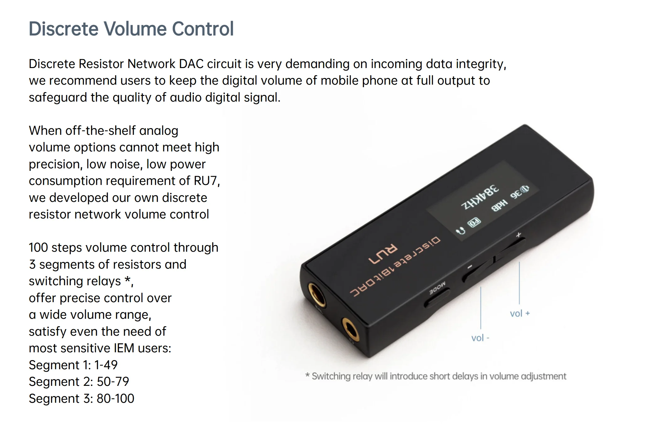 - RU7 sử dụng một hệ thống điều khiển âm lượng 100 nấc dựa trên mạng lưới điện trở và rơ-le, chia làm 3 phân đoạn. Thiết kế này giúp kiểm soát âm lượng một cách cực kỳ chính xác, mượt mà. Tránh được sự mất cân bằng kênh ở mức âm lượng thấp. Đặc biệt hữu ích khi dùng với các tai nghe có độ nhạy cao.