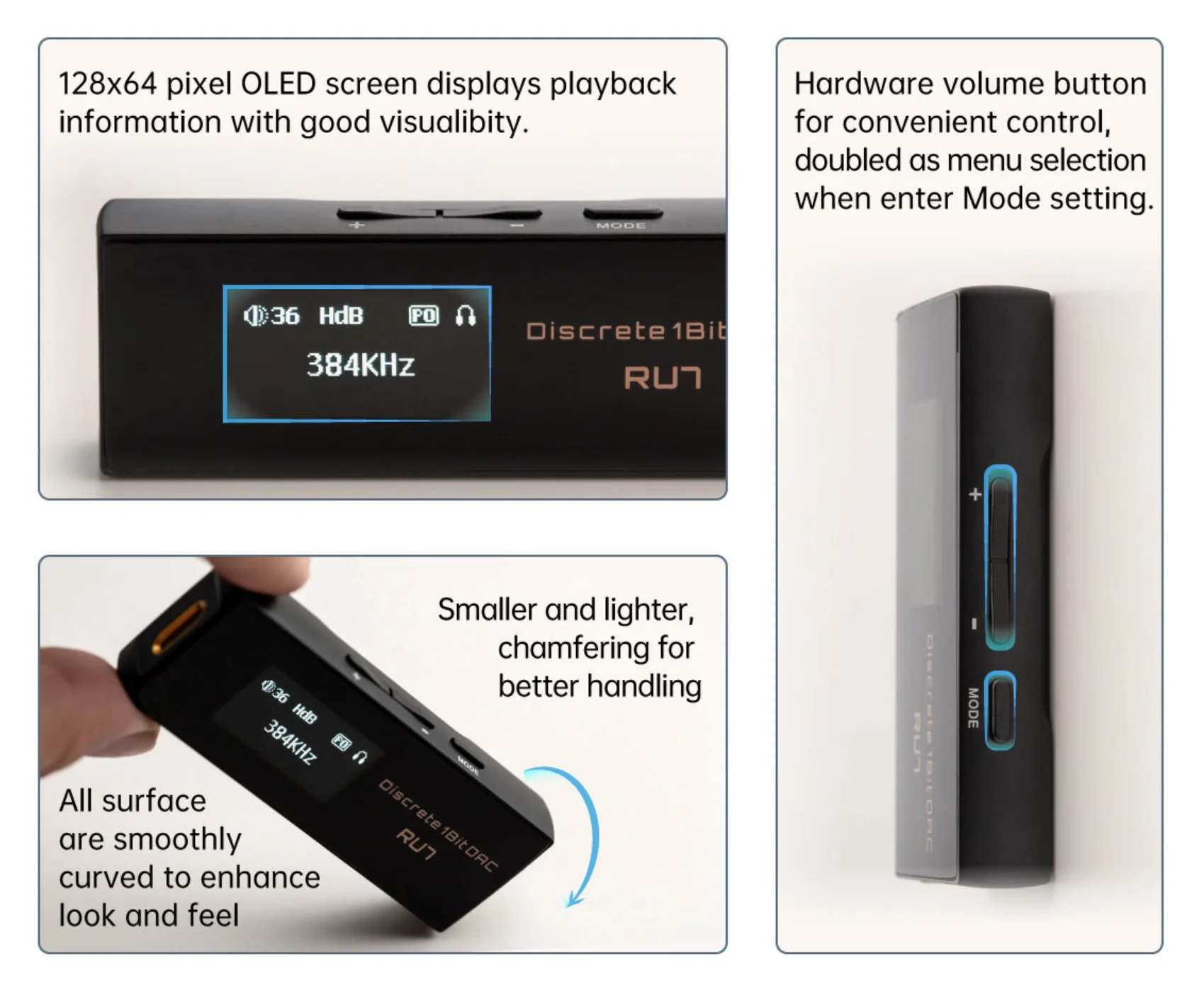 - Màn hình OLED 0.96 inch hiển thị đầy đủ các thông tin quan trọng. Như định dạng nhạc, tần số lấy mẫu, mức âm lượng, và chế độ gain (High/Low).