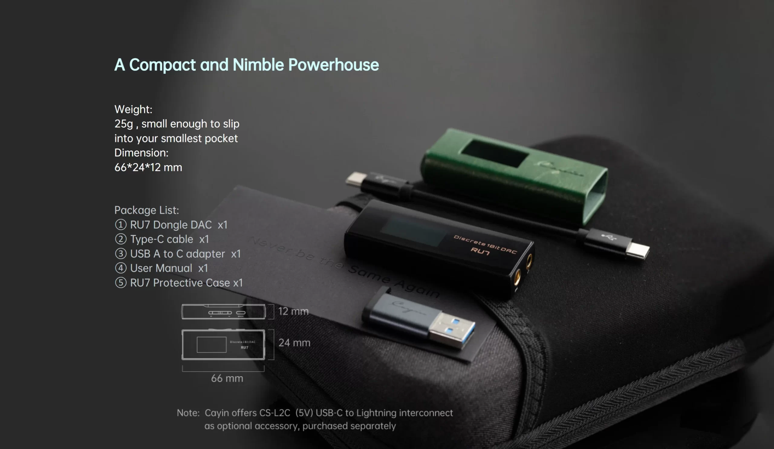 Cayin RU7 sử dụng cổng kết nối USB-C và đi kèm cáp chuyển đổi, kết nối dễ dàng với nhiều loại thiết bị: