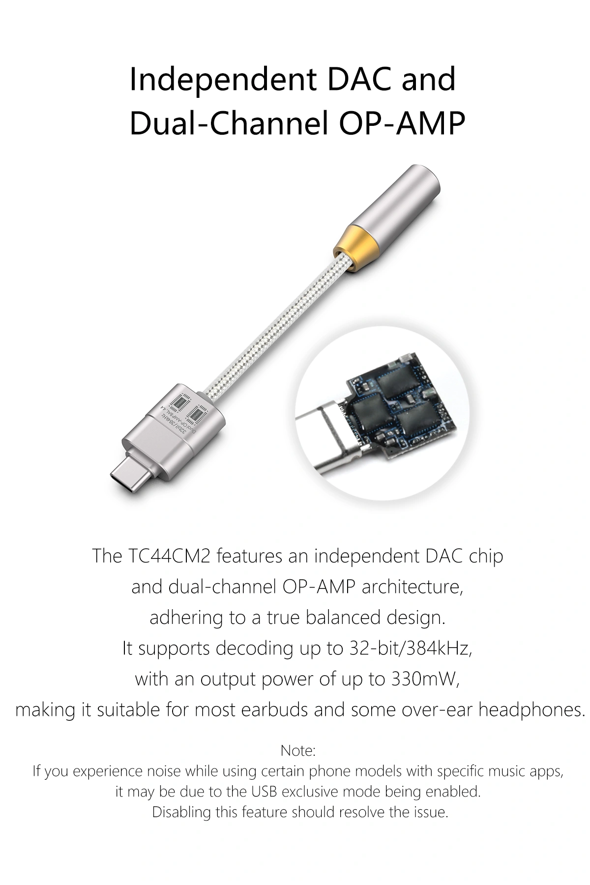 TC44CM2 sử dụng kiến trúc true balanced với chip DAC độc lập và dual OP-AMP ES9603Q (2 chip riêng biệt), hỗ trợ giải mã PCM lên đến 32bit/384kHz (không hỗ trợ DSD native). Công suất đầu ra mạnh mẽ ≥330mW @32Ω (THD+N <1%), đủ drive tốt hầu hết IEM nhạy lẫn một số headphone over-ear khó tính (lên đến 600Ω). Các thông số khác ấn tượng: SNR ≥114dB, Dynamic Range >120dB, THD <0.005%, noise floor siêu thấp chỉ 3μV – mang lại nền đen sạch, chi tiết cao mà không hiss với IEM nhạy.