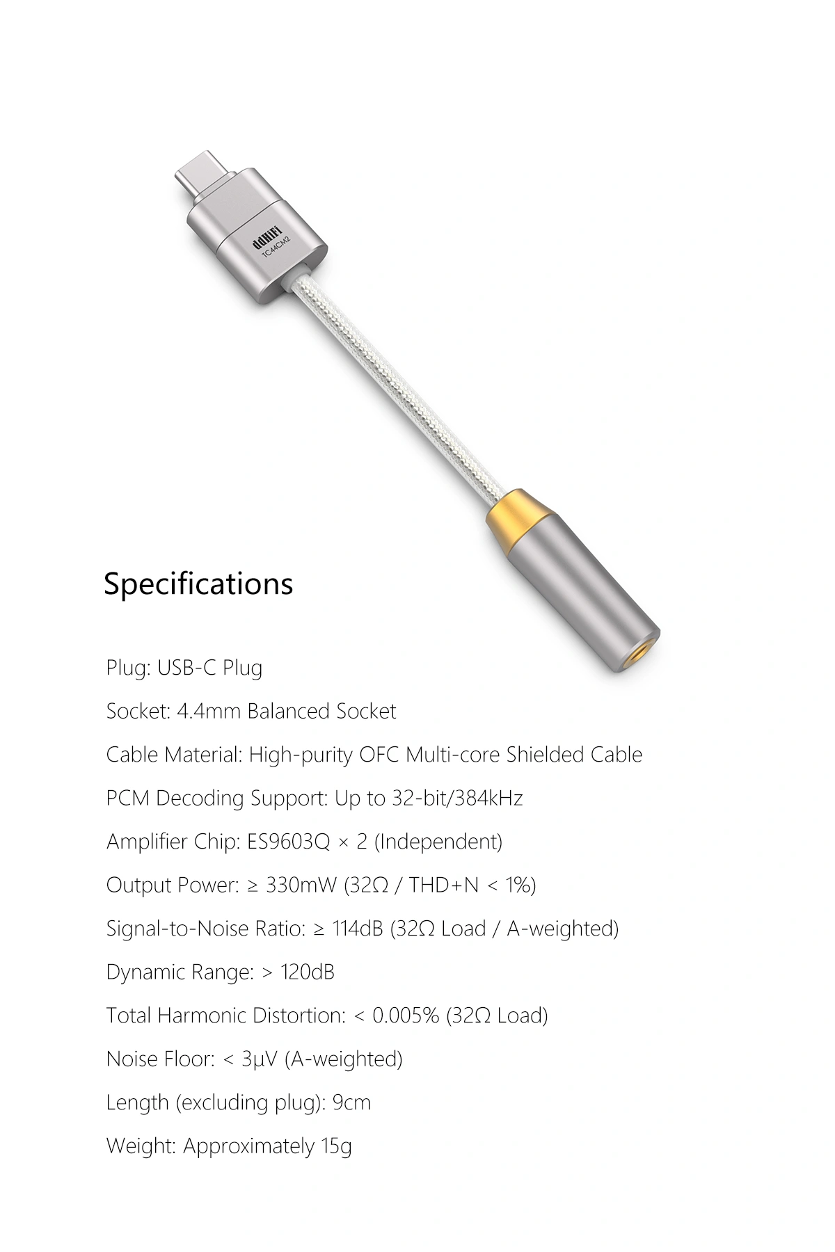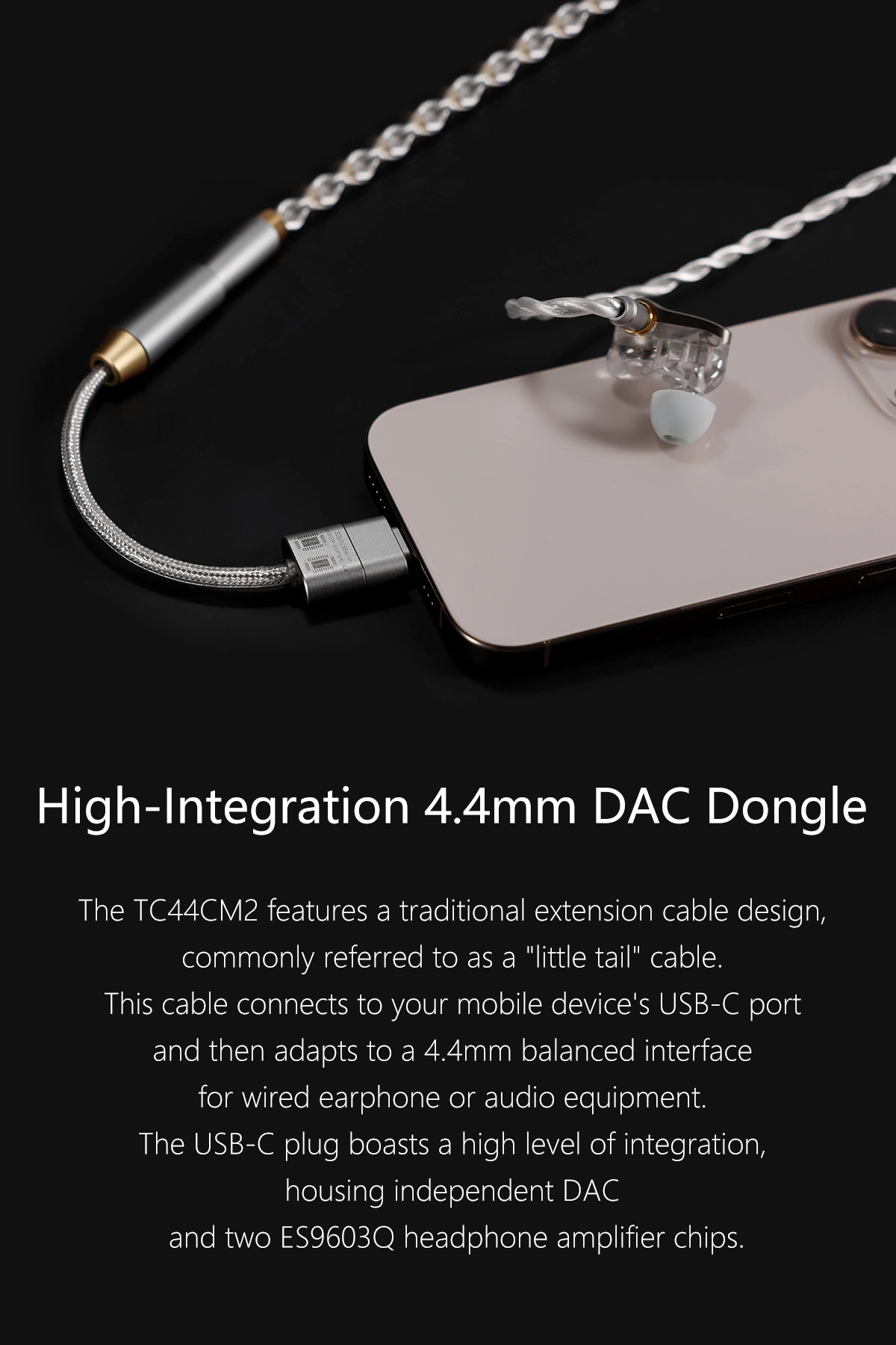 Thiết kế theo kiểu cáp nối đuôi ngắn (dài khoảng 9cm, nặng 15g), kết nối trực tiếp USB-C nguồn phát đến jack 4.4mm balanced female, giúp setup gọn nhẹ, giảm rối dây và tiện mang theo. Vỏ được gia công CNC từ hợp kim nhôm hàng không chắc chắn, kết hợp lớp che chắn toàn diện (full metal shielding + braided shield) chống nhiễu EMI/RFI hiệu quả, molded injection tại hai đầu plug để tăng độ bền chống kéo giật, uốn cong – phù hợp môi trường sử dụng khắc nghiệt.