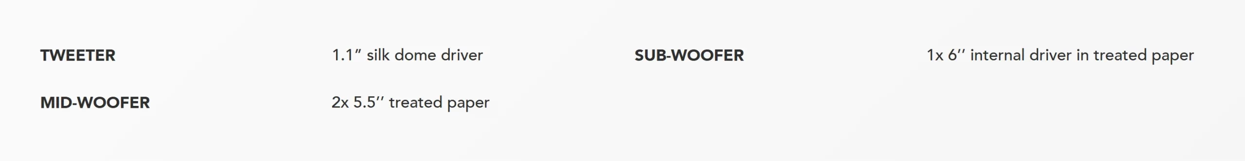 Loa Subwoofer: 1 củ loa SEAS 6 inch (6") nằm bên trong thùng loa. Củ loa này được đặt trong một buồng âm riêng biệt và hướng xuống sàn. Thiết kế này giúp kiểm soát dải trầm một cách chính xác, mở rộng âm bass xuống tới 40Hz và giúp loa dễ dàng phối ghép với nhiều phòng nghe khác nhau.